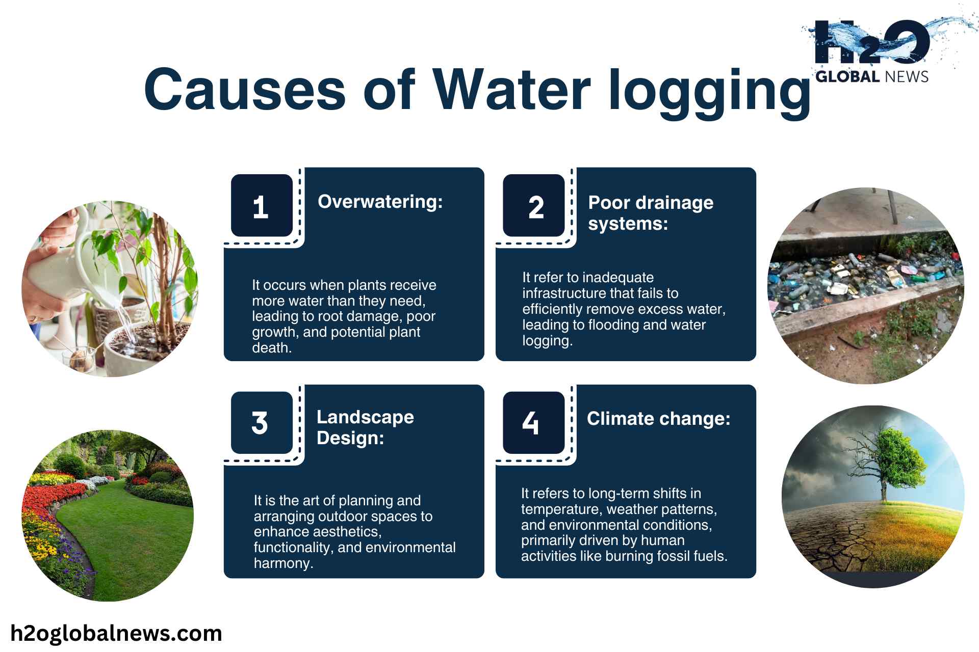 Climate change leads to erratic weather patterns, including heavy rainfall, which overwhelms drainage systems and increases garden water accumulation.