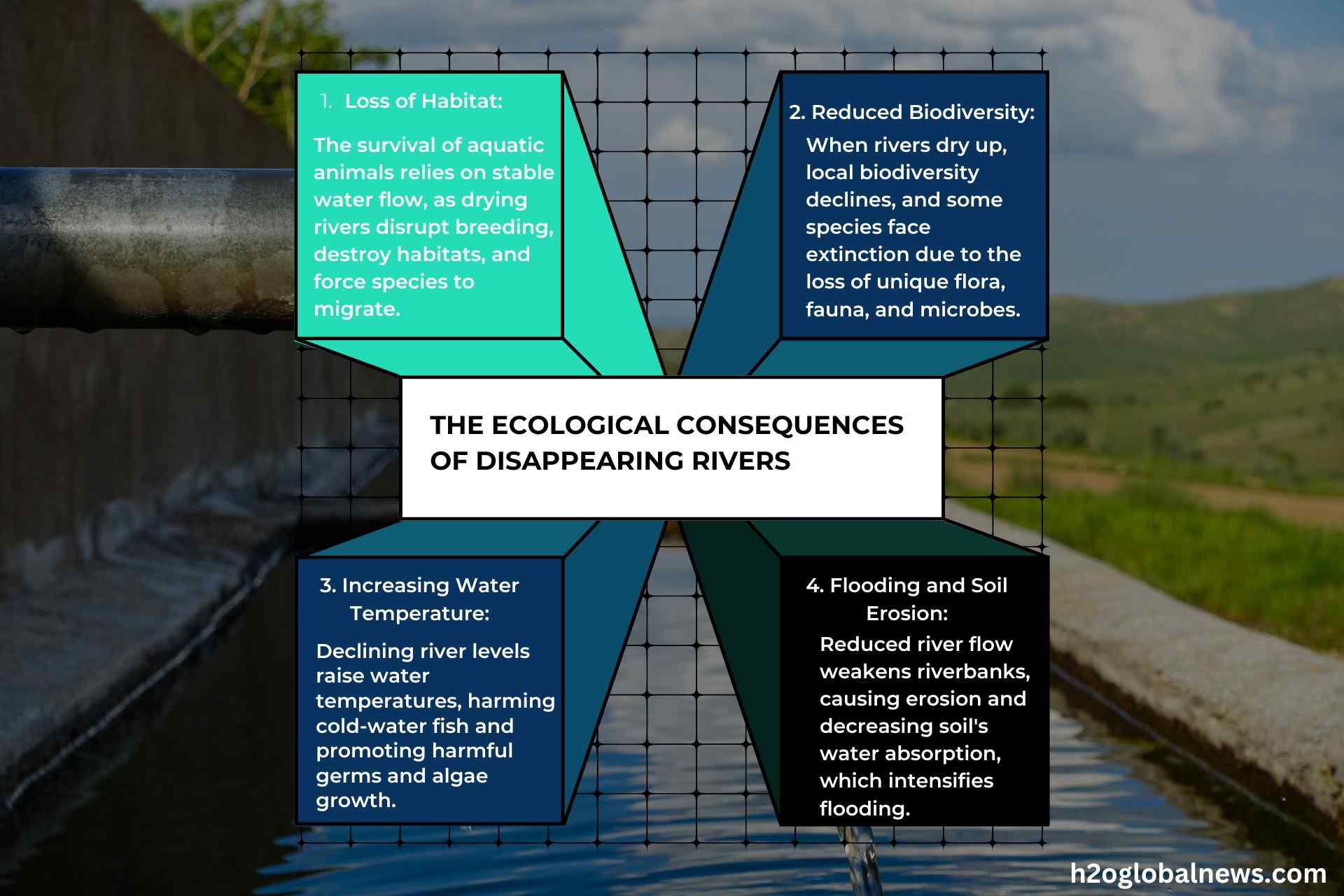 - Loss of Habitat: The survival of fish and other aquatic animals depends on steady water depth and flow. When a river dries up, breeding cycles are disrupted, habitat is destroyed, and species are forced to move—if they can.
